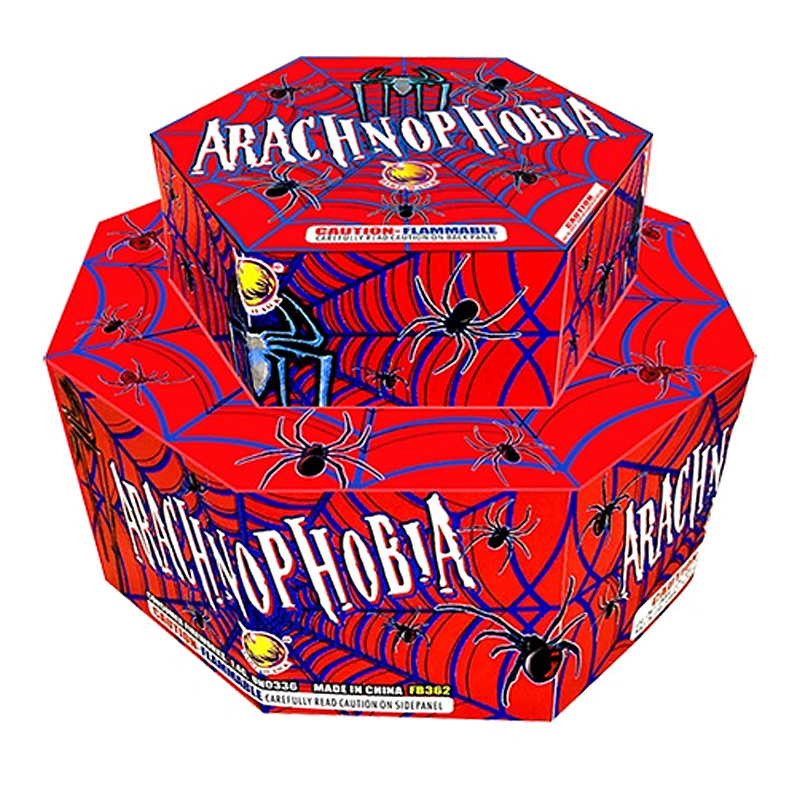 Arachnaphobia: WATCH OUT FOR THE FINALE!! Two Layer Fountain Starts with Combination of Colors, Assorted Chrysanthemums and Cracklings. Wait for the Surprise at the End. The Fountain Will Spray Like a Spider Net That Crawls in All Directions. FB362 Arachnophobia (2-Layer Performance) by Firehawk Fireworks.