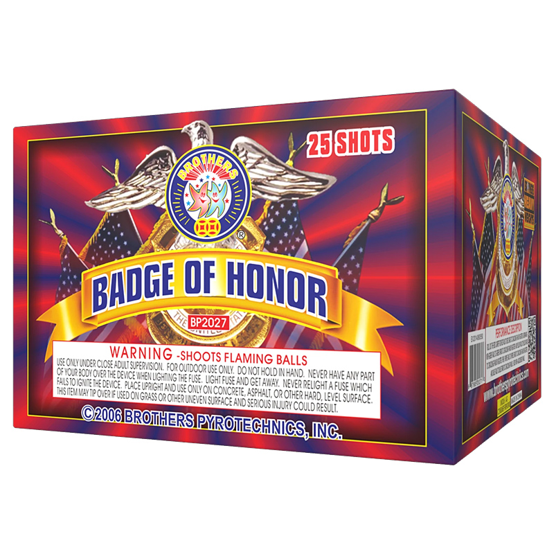 Badge of Honor: Red tails to stars, crackling palms with glitter. Green, yellow, purple then blue tails to stars to crackling palms with glitter and finale. BP2027 Badge of Honor Heavy Weights Cake by Brothers Pyrotechnics Fireworks.