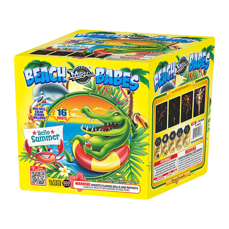 Beach Babes: Fantastic cake with multiple color strobe willow this year! Red strobe/green strobe/gold strobe/silver strobe tail up to red strobe willow/green strobe willow/gold strobe willow/silver strobe willow; 4 shots crackling willow tail up to crackling willow finale! Visual delight! BEACH BABES 16 SHOTS M5056.