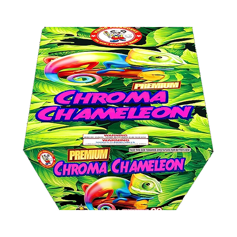 Chroma Chameleon: 500-gram Chroma Chameleon Premium features triple-action color-changing dahlia tails and aerial peony breaks ‒ a magical piece! Chameleon 5000 P5557 Winda Fireworks.