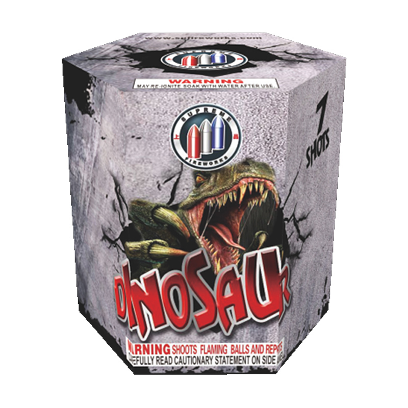 Dinosaur: SP2201A – 7 Shots – Silver tail to silver fish.SP2201B – 7 Shots – Gold tail to gold star; silver tail to silver star; green tail to green star.SP2201C – 7 Shots – Red tail to red star; silver tail to whistling;green tail to green star.SP2201D – 7 Shots – Red tail to whistling, red tail to red star and white strobe.SP2201E – 7 Shots – Red star to strobe; green star to green strobe; gold tail to time rain.SP2201F – 7 Shots – Gold tail to gold strobe; red tail to color peony;green tail to whirlwind. SP2201 Dinosaur 7 Shots Supreme Fireworks Factory.
