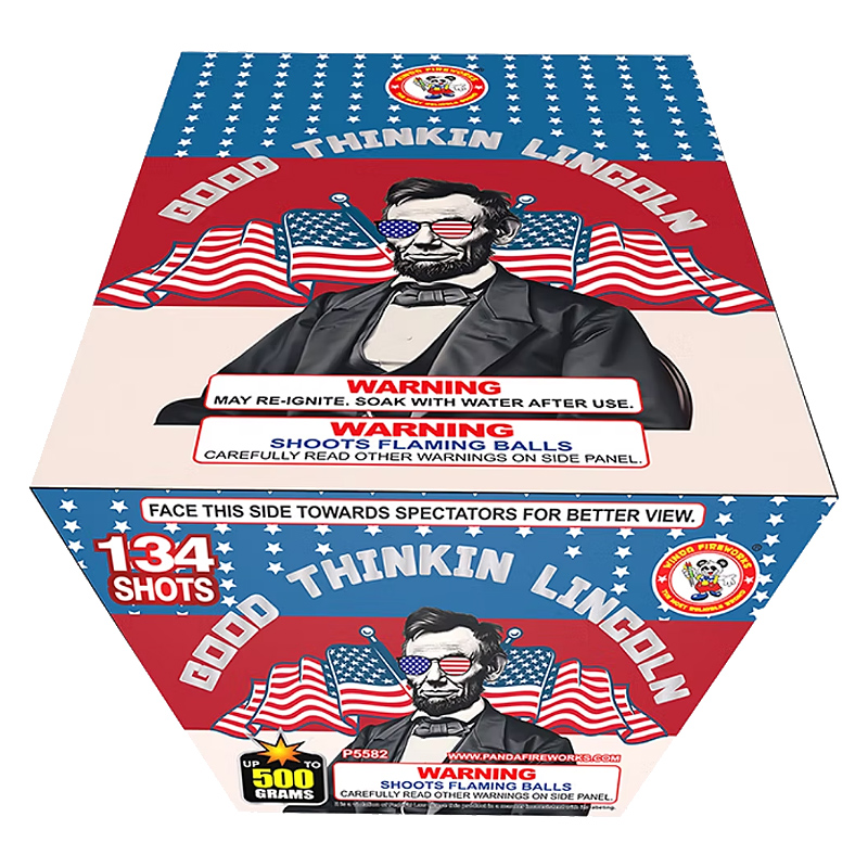 Good Thinkin Lincoln: 126-shot, long lasting cake features red, white and blue aerial breaks alternating with fanned shots of gold sizzling tails, palm tails and red tip crackling tails. GOOD THINKIN LINCOLN P5582 WINDA FIREWORKS 2024 NEW ITEM.