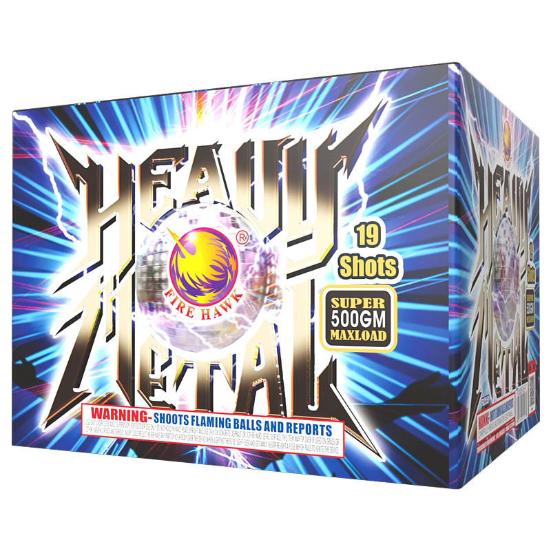 Heavy Metal: Crackling Tail to Blue Peony with Glittering, Silver Coconut, end with 4 rapid shot of Red and Silver to Crackling. FB2559 19 Shot Heavy Metal by Firehawk Fireworks.