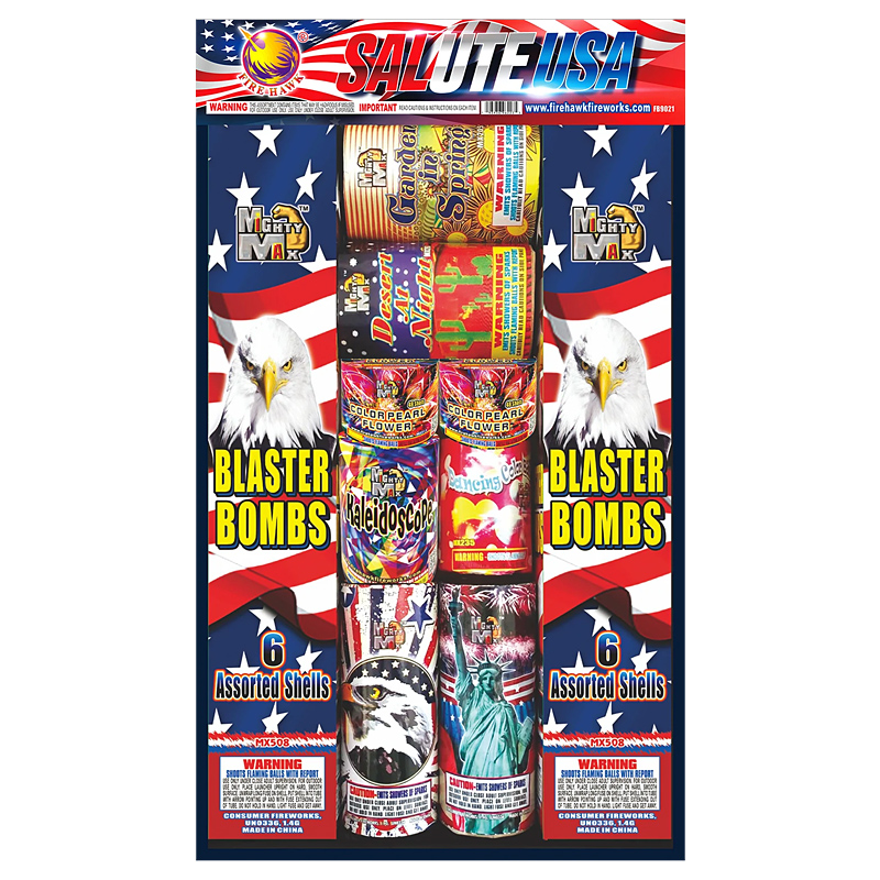 Salute USA: 2 box MX508 1.5″ Blaster Bomb Artillery Shells (Artillery Shells, Multiple Shots & Fountains) 1 pc MX205 7 Shot Garden in Spring 1pc MX207 7 Shot Desert At Night 2pc MX211 48 Shot Color Pearl 2pc MX321 July 4th (JF4) Fountain 1pc MX235 Dancing Color Ball 1pc MX208 Kaleidoscope. FB9021 Salute USA Assortments by Firehawk Fireworks.