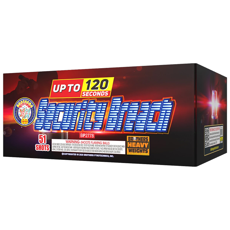 Security Breach: Alarms sound. Lights flash. Yellow tails to yellow bouquet, blue tails to blue bouquet, yellow tails to brocade, purple tails to purple stars and silver tails to delayed crackling. Ends with a three-shot finale of crackling tails to crackling. BP2778 Security Breach 51 shots (Up to 2 minutes!) by Brothers Pyrotechnics Fireworks.