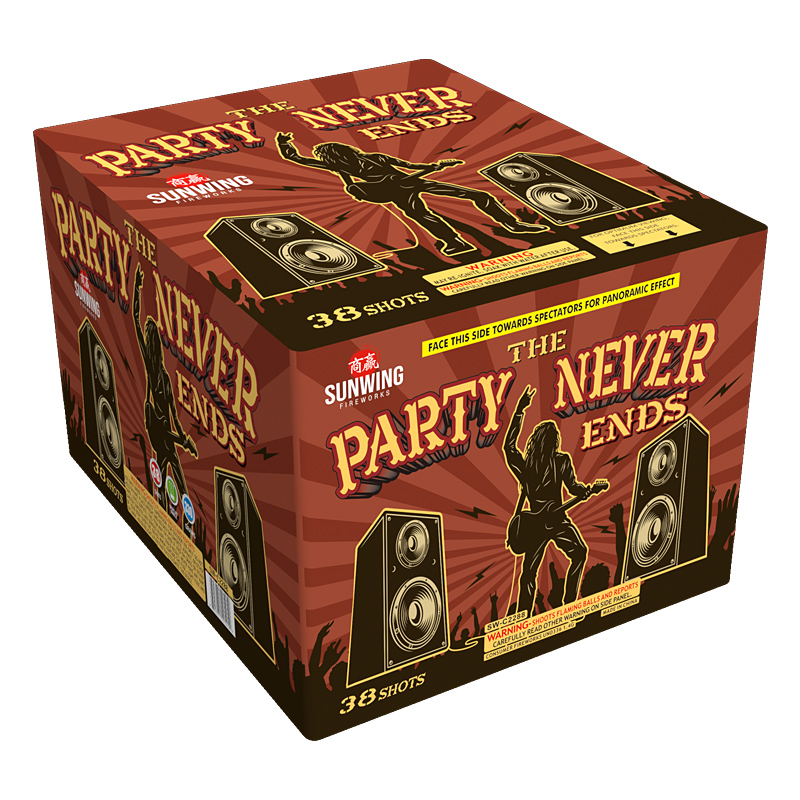 The Party Never Ends: Red blue white strobe, llemon green with crackling, chrys, brocade crown with blue, purple with time rain, red green swimming star lance,red blue time rain. The Party Never Ends! 500 Gram Cake by “Sunwing Fireworks” NEW FOR 2021!